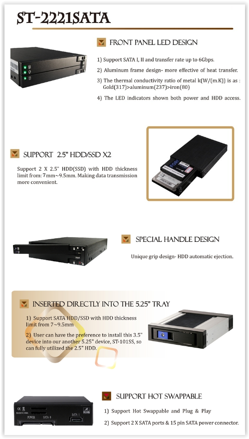 מגירה שליפה ל-2 דיסקים קשיחים 2.5 אינצ' אלומיניום SNT-2221-SATA 2x2.5'' SATA3,SSD To 3.5