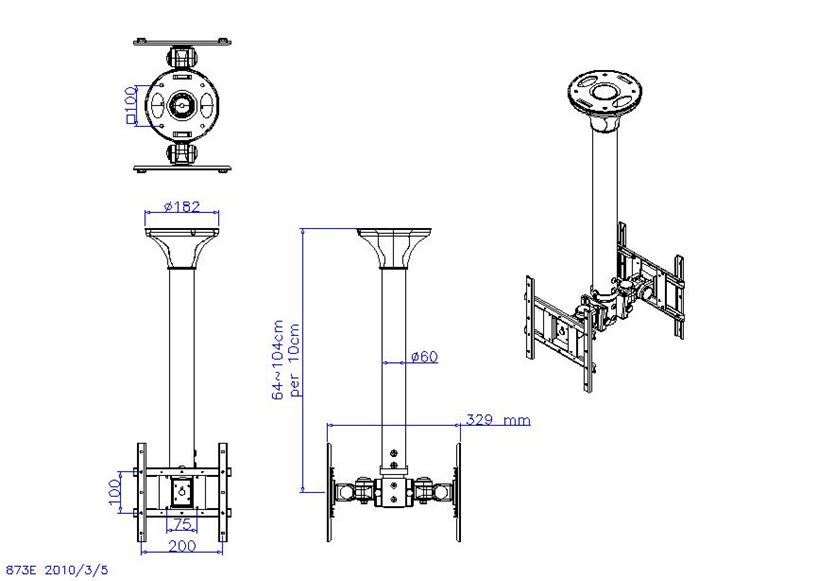 זרוע תקרה כפולה לשתי טלוויזיות כולל הטייה וסיבוב עד 42'' משקל עד 40 ק''ג GoldTop Tech Arm GT873EB Ceiling Dual TV Mount 640mm Up To 1040mm