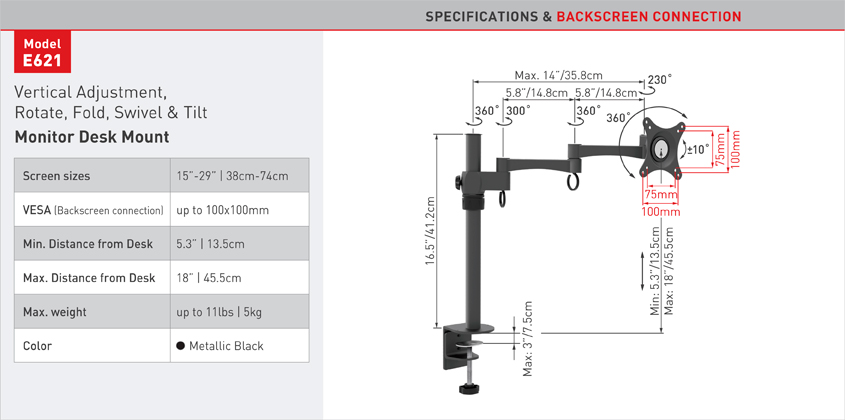 זרוע תלייה למסך חיבור מלחציים לשולחן עם שלושה מפרקים 5 תנועות Barkan E621 Arm LCD Mount
