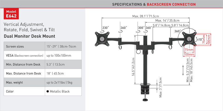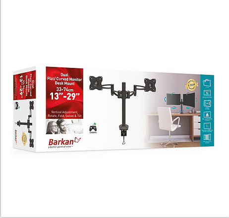 זרוע מפרקים שולחנית לשני מסכי מחשב נצמד לשולחן מלחציים עד ''29 עד משקל 8 ק''ג ברקן Barkan E642 Arm LCD Mount