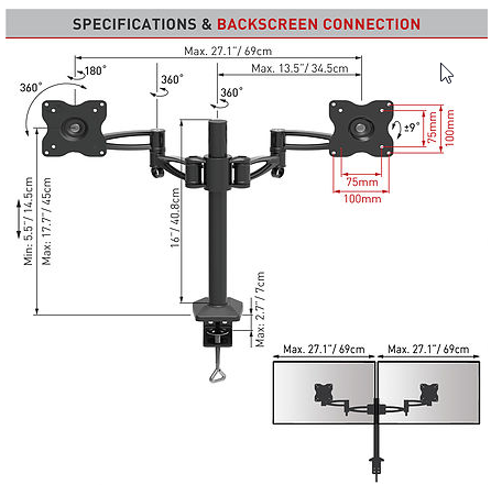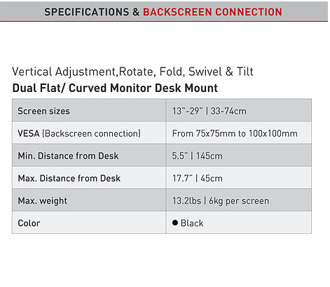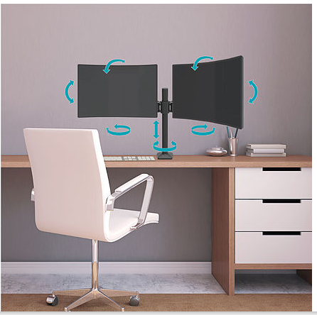 זרוע כפולה למסך מחשב, במשקל עד 5 ק"ג, עם חיבור לשולחן.