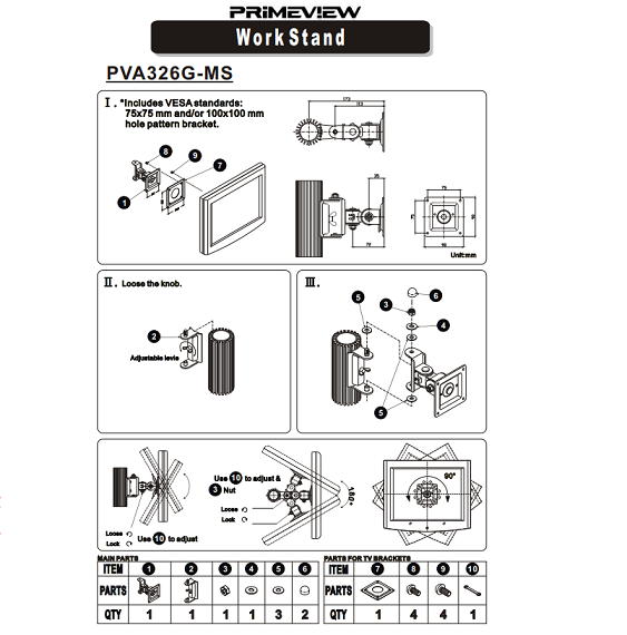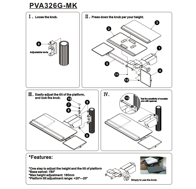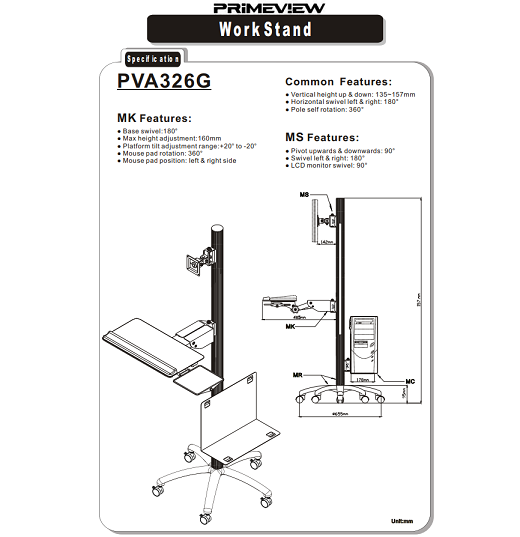 עמדת עבודה ניידת עבור מחשב נייח מסך כולל כיוון גובה מקלדת ועכבר כיוון גובה לעבודה בעמידה PrimeView PVA326G Screen Mobile Carts Work Stand VESA 75-100
