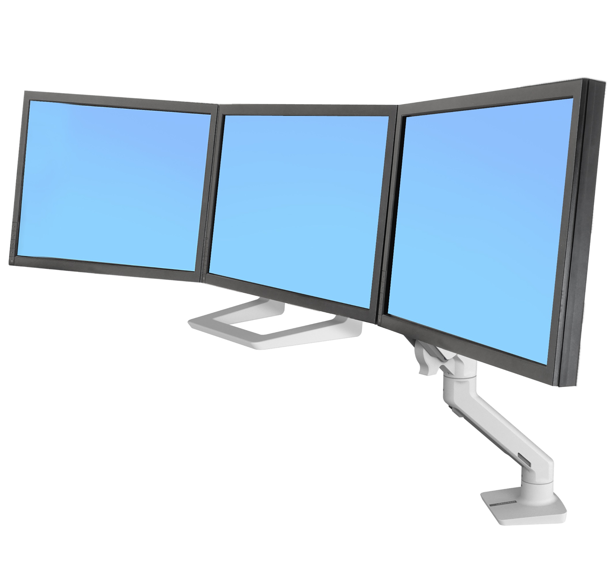 זרוע שולחנית הכוללת מסילה מתכווננת לנשיאת שלושה מסכי מחשב זה לצד זה,