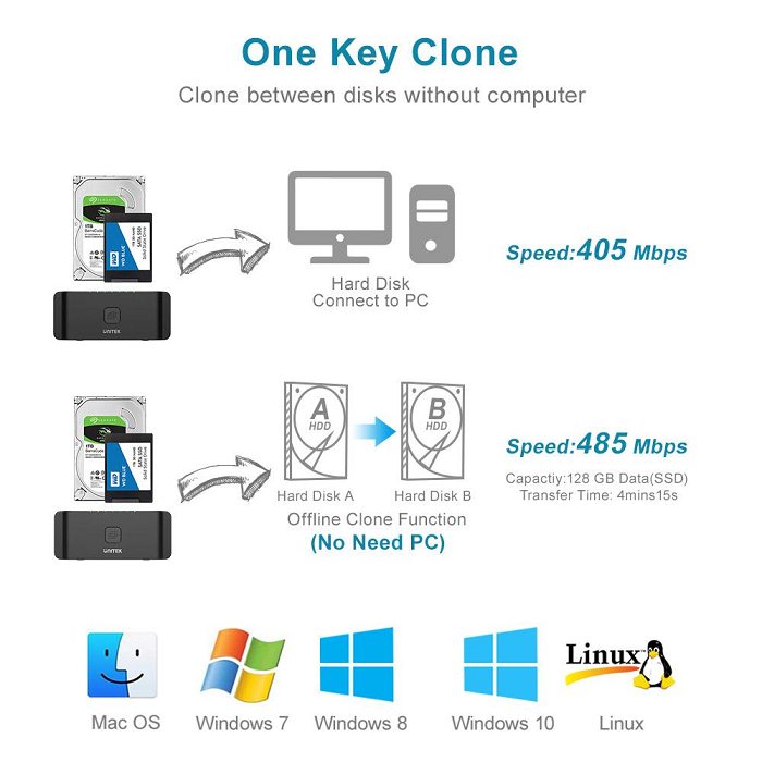 תחנת העגינה יכולה להפעיל שיבוט לא מקוון ללא תלות ממחשב. קל לשכפל נתונים מכונן קשיח אחד לאחר.