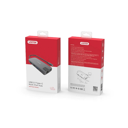תחנת עגינה למחשב נייד משולב כרטיס מסך חיצוני ומתאם רשת יוניטק Unitek Y-DK09016 USB3.1 Type-C Multi-Port Hub with Power Delivery