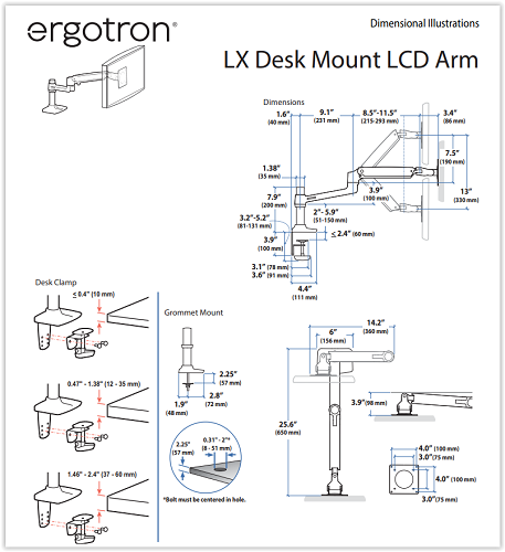 זרוע הידראולית שולחנית למסך מחשב חיבור לשולחן מלחציים (אפשרות הברגה) ארגוטרון Ergotron 45-241-224 LX Desk Monitor Arm, matte black