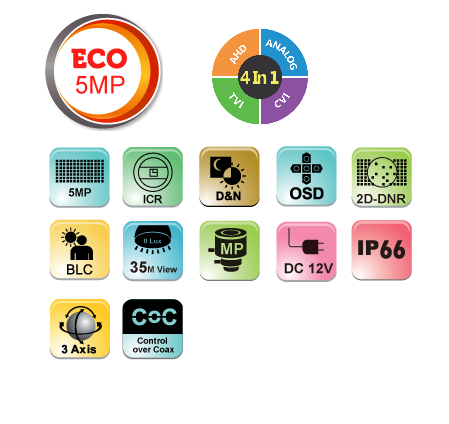 Selectable Output: 5MP/4MP 4in1 + PAL/NTSC