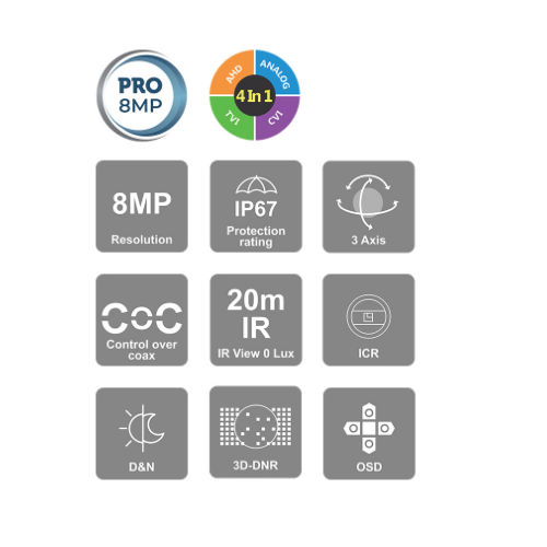 • פלט לבחירה: 8MP: 3840×2160 AHD/TVI/CVI 5MP: 2592×1944 AHD/TVI 4MP: 2560×1440 AHD/TVI/CVI CVBS: 700TVL