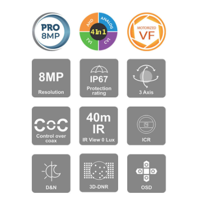 • פלט לבחירה: 8MP: 3840×2160 AHD/TVI/CVI 5MP: 2592×1944 AHD/TVI 4MP: 2560×1440 AHD/TVI/CVI CVBS: 700TVL
