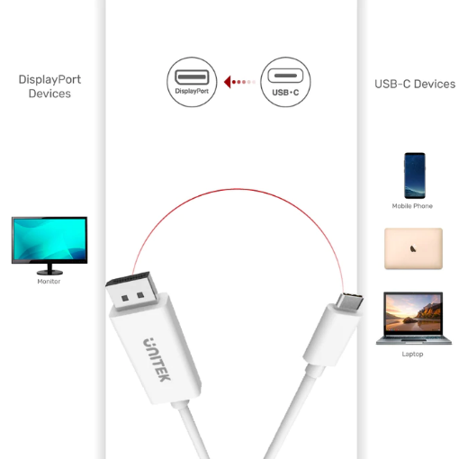 כבל מסך איכותי 1.8 מטר יו אס בי סי לדיספליי פורט יוניטק Unitek V400A 4K 60Hz USB-C to DisplayPort 1.2 Cable in White