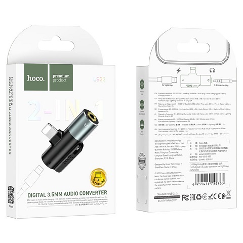 מתאם לאייפון כפול מפצל לשמע וטעינה הוקו Hoco LS32 Adapter Lightning to 3.5mm audio converter charging current 2A