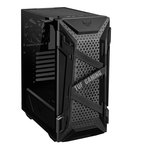 מארז קומפקטי של ASUS TUF Gaming GT301 ATX באמצע המגדל עם פאנל צדדי מזכוכית מחוסמת, פאנל קדמי של חלת דבש, מאוורר RGB 120 מ"מ AURA הניתן להתייחסות, מתלה לאוזניות ותמיכת רדיאטור 360 מ"מ.
