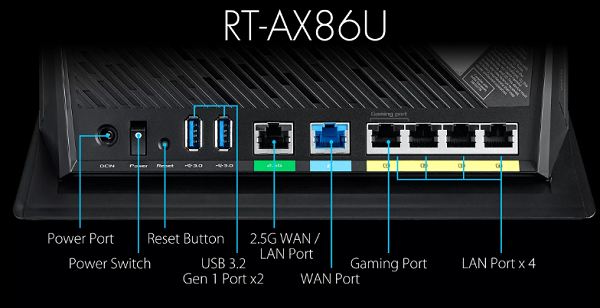 נתב ראוטר אלחוטי לגיימרים מאיץ משחקים מובנה Asus RT-AX86U AX5700 Dual Band WiFi 6 Gaming Router, PS5 compatible, Mobile Game Mode, Lifetime Free Internet Security, Mesh WiFi support, 2.5G Port, Gaming Port, Adaptive QoS, Port Forwarding