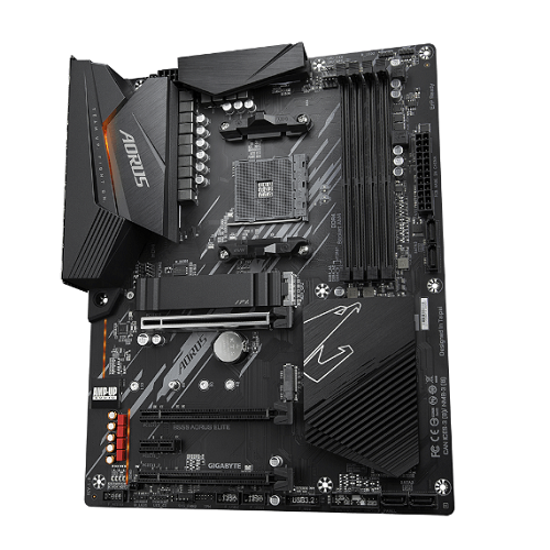 לוח אם AMD B550 AORUS עם VRM דיגיטלי אמיתי 12+2 פאזות, גופי קירור משטחים מוגדלים, חריץ PCIe 4.0 x16, Dual PCIe 4.0/3.0 x4 M.2 עם מגן תרמי אחד, LAN 2.5GbE, RGB FUSION 2.0, Q-Flash