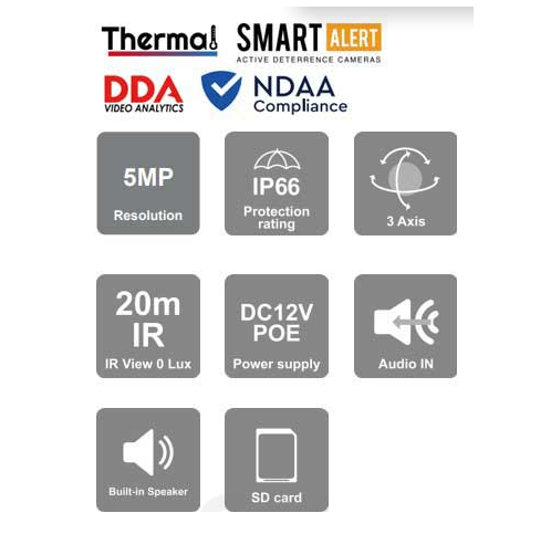 מצויד במנגנוני ה-DDA™ Analytics שלנו (זיהוי, הבחנה, התראה) ומנגנוני הרתעה פעילים (מנורת הבהוב לבן ורמקול),