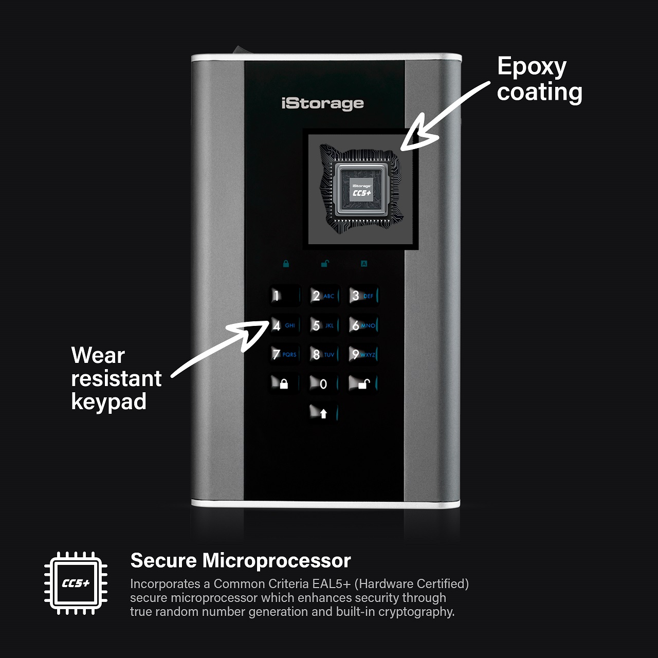 דיסקAshur DT² USB 3.2 Gen 1 HDD הוא כונן שולחני מוצפן, מאחסן ומגן על נתונים בסטנדרטים צבאיים, מאומת PIN, מאושר FIPS, AES-XTS 256-bit חומרה מוצפן.