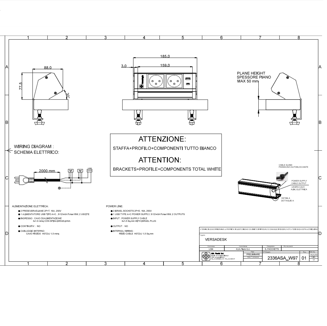 עמדת טעינה על השולחן VERSADESK כולל 2 חשמל + USB A+C וכבל הזנת מתח 2 מטר.