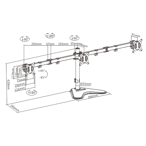 עם מבנה פלדה עמיד, ה-LDT66-T034 מספק תמיכה יציבה לשלושה צגים בגודל 17 אינץ' עד 27 אינץ' של עד 9 ק"ג (19.8 פאונד) לכל זרוע.