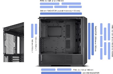 בהגדרה נמוכה יותר, לוח האם משאיר רווח בעובי של 63 מ"מ בחלק העליון כדי להתקין שילובי רדיאטור/מאוורר,