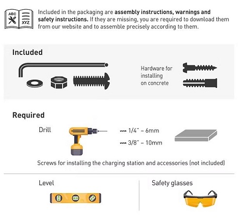 כולל מסילות מודולריות לחיבור עמדות הטעינה והאביזרים שלהן (וו תלייה לגלגול הכבל, מפסק חשמל,