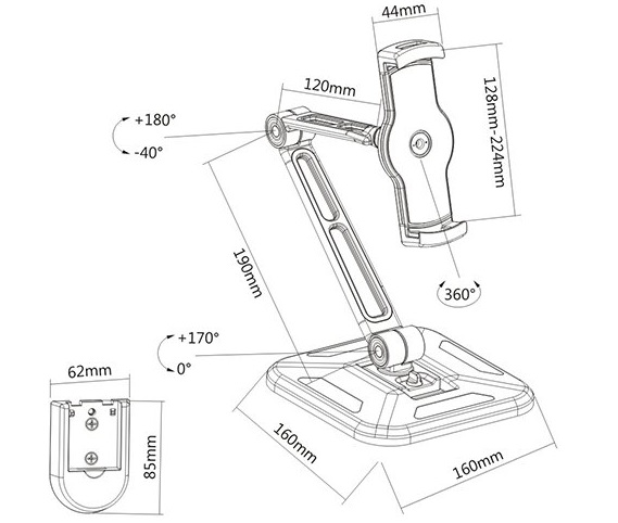 רוחב מחזיק מתכוונן: 128~224 מ"מ (5"~8.8")