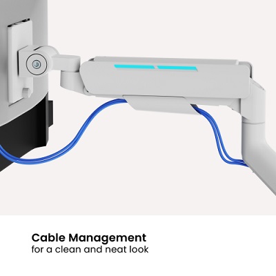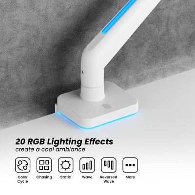 זרוע לבנה כולל תאורה למסך כבד שולחנית הידראולית דו מפרקית למסכך מחשב נצמד לשולחן (אפשרות הברגה) לגודל מסך עד 49 אינץ' עד משקל 20 קילו כולל כיוון גובה Lumi LDT85-C012L White Heavy-Duty RGB Gaming Monitor Arm For 17-49 Inch monitors