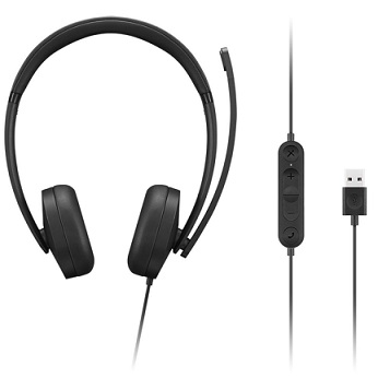 אוזניות הסטריאו החוטיות Lenovo USB-A Gen 2 הן אוזניות מקצועיות הכוללות תיבת בקרה עם כפתור השתקה,