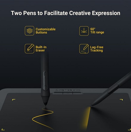 # שני עטים בגדלים שונים מגיעים כסטנדרט עם הטאבלט שלנו, שניהם ניתנים להתאמה אישית מלאה לזרימת העבודה שלכם. לעט הרחב יותר בעל קנה 3 הכפתורים כולל שלושה כפתורים הניתנים לתכנות + מחק כדי להפוך את העט