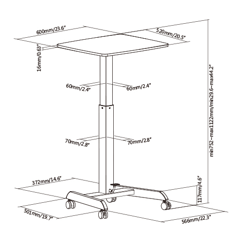 בלחיצה על דוושת רגל פנאומטית, תחנת העבודה הניידת FWS07-2 ניתנת לכוונון גובה בין 752 ל- 1122 מ"מ,