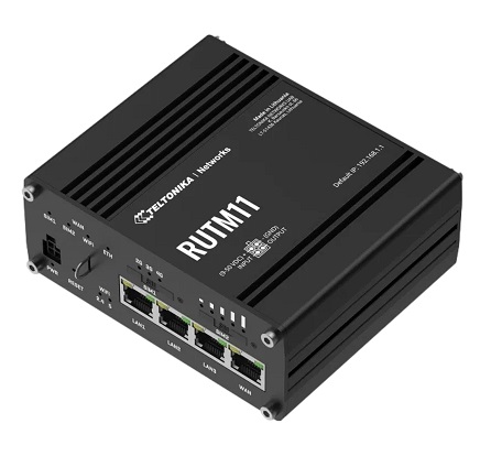 נתב תעשייתי מוקשח אלחוטי סלולארי סים כפול ארבע אנטנות מניעת התקפות DDOS, חיבור VLAN לפי פורט טלטוניקה TELTONIKA RUTM11 4G LTE VPN Router Dual Sim 300Mbps Wireless WiFi-5 4xGigabit Ethernet RJ45 GPS GNSS
