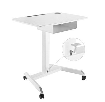 שולחן נייד ישיבה עמידה מתכוונן בגובה עם מדף להנחת פריטים כוונון על ידי רגלית משטח 560x800 מ''מ מדף 260x400 מ''מ מחזיק כוסות וחריץ לטאבלט נשיאה עד 8 קילו לבן לומי Lumi FWS07-4 White Height Adjustable Mobile Workstation With Drawer A Mobile Stand for Presentations or an Active Work Style
