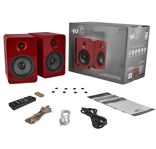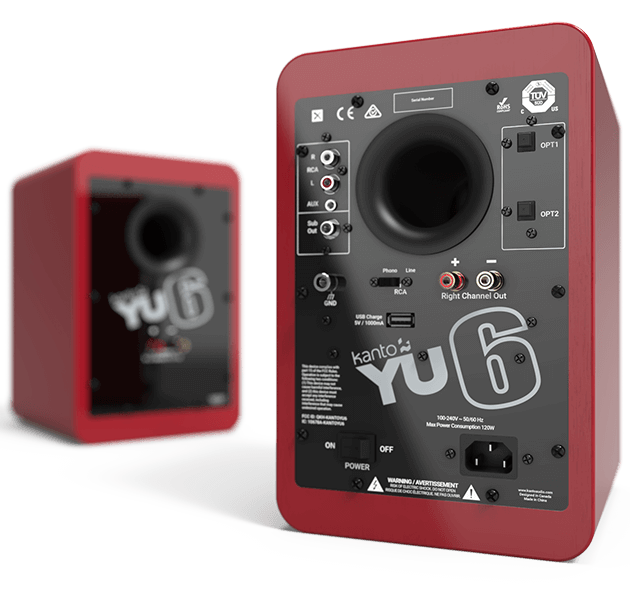 זוג רמקולים מוגברים מפוארים מעץ אלחוטים למחשב צבע אדום קאנטו Kanto YU6 Powered Speakers with Bluetooth and Phono Preamp 200Watts Bluetooth Gloss Red