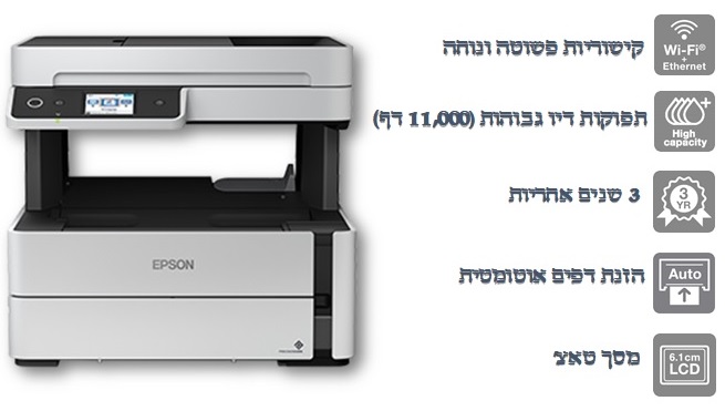 מדפסת משולבת אפסון פקס,סורק.מכונת צילום הזרקת דיו צבעונית דופלקס אלחוטית Epson EcoTank M3170