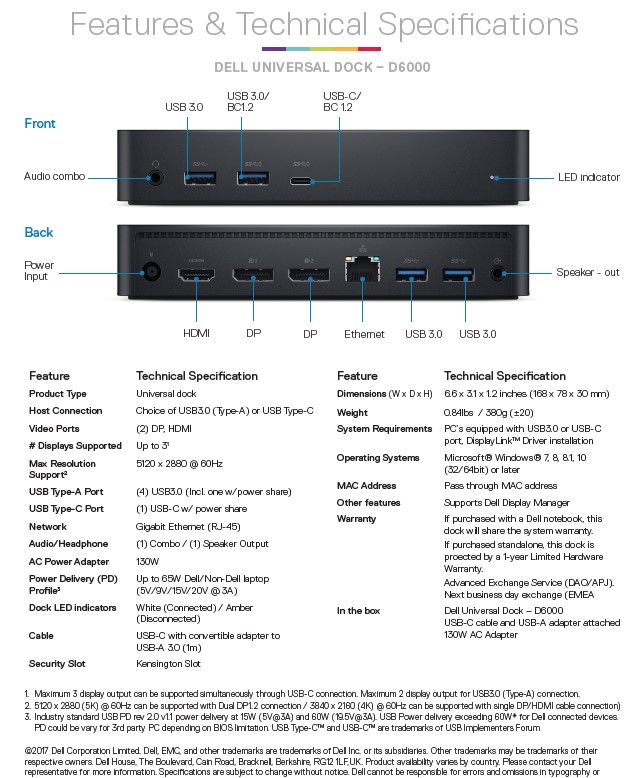 תחנת עגינה אוניברסלית למחשב נייד דל Dell Universal Dock D6000 452-BCYG up to three 4K displays USB 3.0,USB-C 65W laptop