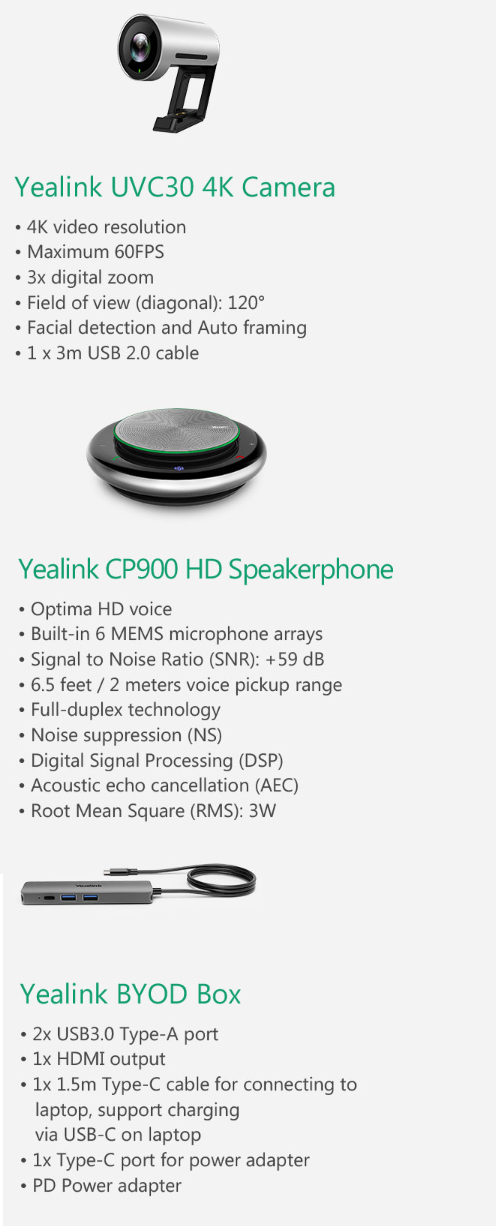 מצלמה מקצועית לשיחות ועידה לחדרי ישיבות מיקרופון מוגבר זווית צפייה 120 מעלות כולל טכנלוגיה לזיהוי פנים Yealink UVC30-CP900-BYOD Meeting Kit 4K UHD USB Zoom Digital X3 Desktop Confrence Camera HDMI + USB 3.0