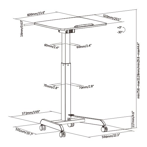 תחנת העבודה הניידת FWS07-1 ניתנת להתאמה לגובה מ- 758-1128 מ"מ (29.8 "~ 44.4"),