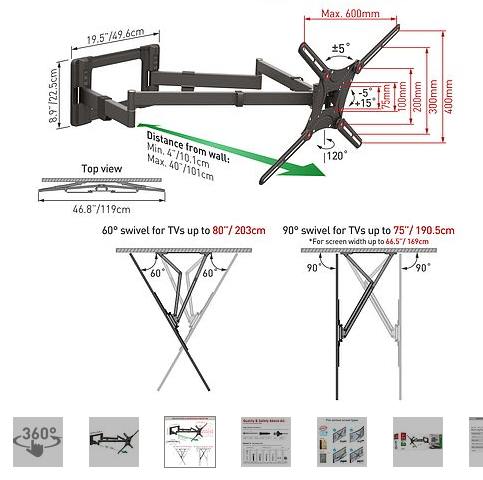 זרוע אקורדיאון ארוכה מאוד לטלוויזיה מאפשרת סיבוב מסך 80 אינץ' ב- 90° מפרקים כפולה מתאימה לפינה עד 75 אינץ' ומשקל עד 50 קילו מרחק מקסימלי מהקיר 10.1-101.3 ס''מ ברקן Barkan BM464XL Dual Arm TV Wall Mount