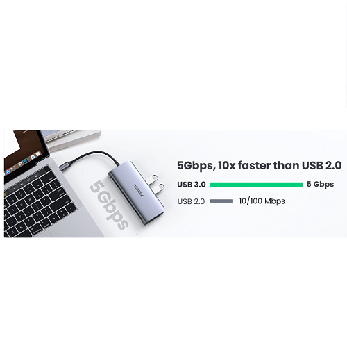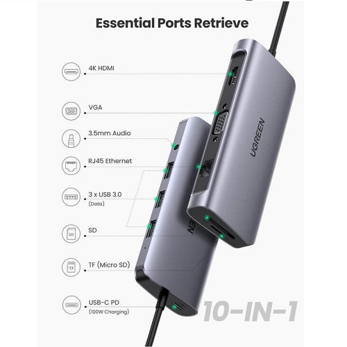 תכונות: תחנת עגינה יוגרין מתאים ל 10 חיבורים UGREEN 80133 10 Ports Hub Type-C HDMI RJ45 AUX3.5
