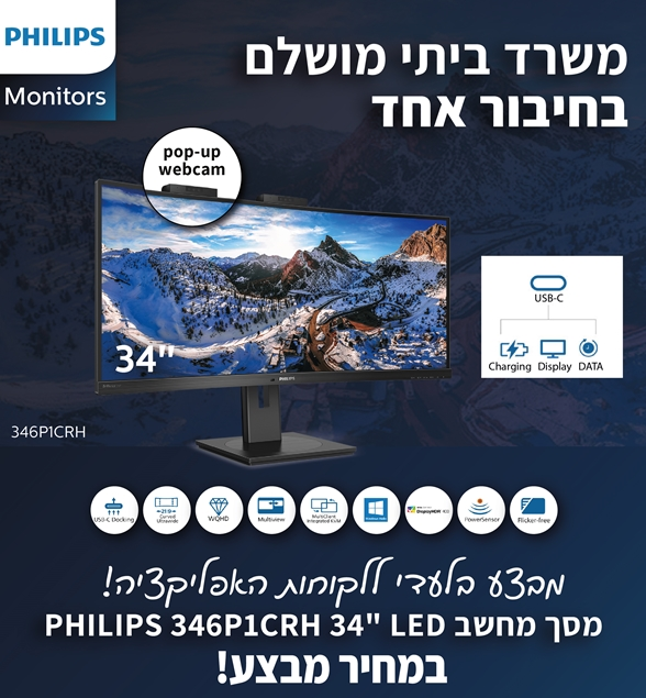 מסך מחשב רחב קעור מולטימדיה כולל מצלמה קופצת רמקולים ומתג KVM להחלפה בין מקורות פיליפס Philips Curved UltraWide LED Monitor with USB Type-C 346P1CRH 34 Inch 4K VA WQHD 3440x1440 Resolution 100HZ Refresh Rate 4ms 21:9 KVM MULITI-VIEW Camera Type-C HDMI Display Port