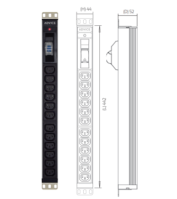 פס פאנל 12 שקעים חשמל + כבל 3 מטר להתקנה בארון שרתים שקע ישראלי סטנדרטי Advice ADG-P12K Power Distribution Unit 12 Sockets 16A