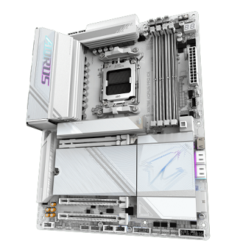 לוח-אם צבע לבן למעבד איי.אמ.די רייזן AM5 לגיימרים ג'יגהבייט Gigabyte X870E AORUS Pro ICE ATX DDR5 WiFi 7 Bluetooth 5.3 2x NVME Gen5 2x USB-C Support DP 2.5GbE