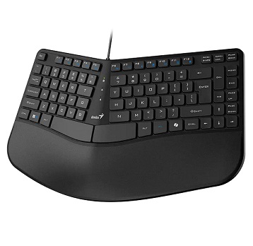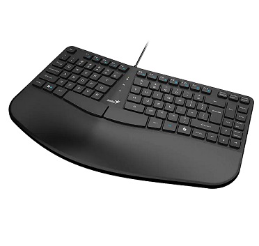 מקלדת Genius Ergo KB-700, עם פריסת גל מפוצלת שתוכננה לקדם מיקום טבעי של היד ולהקל על מאמץ שרירים באזור האמה, שורש כף היד והכתף, מותאמת לאלו המחפשים מקלדות ארגונומיות ופתרונות הקלדה חלקים.